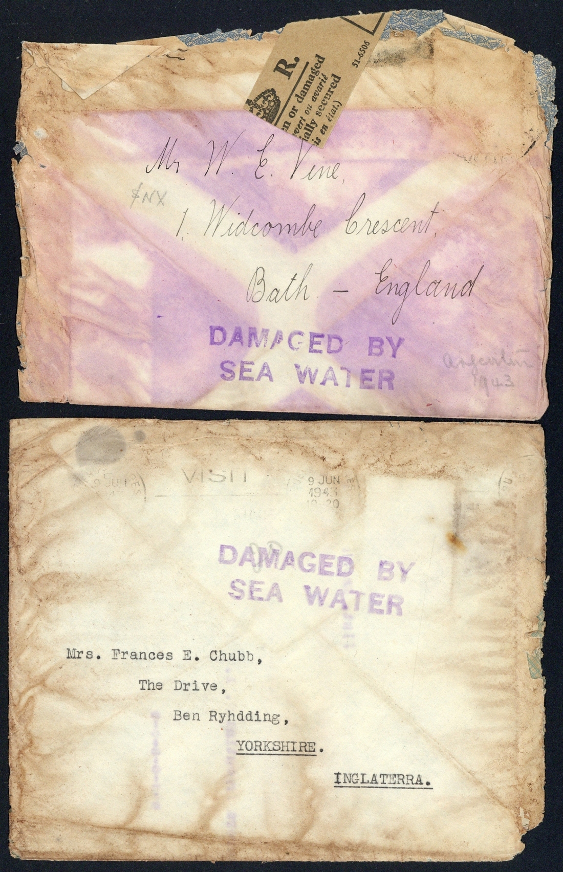 1943 (June) envelopes (2) from Argentina to England, both showing "damaged by/sea water" handstamp in violet, both suffering water damage, one with Post Office seal. Possibly carried on the 'Venezia'