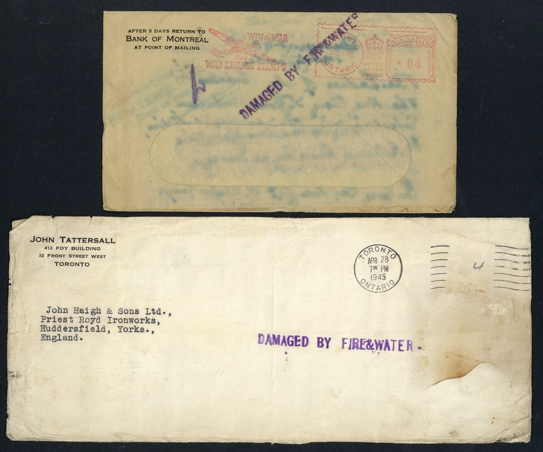 1945 (27-28 Apr.) sinking of the S.S. 'Scythia', envelopes (2) from Toronto, one to Huddersfield and the other a window envelope with 4c. meter mark (type D1a with additional slogan), both covers bear fine strikes of the type 1 cachet "damaged by fire&water" in violet. Over 200 covers known