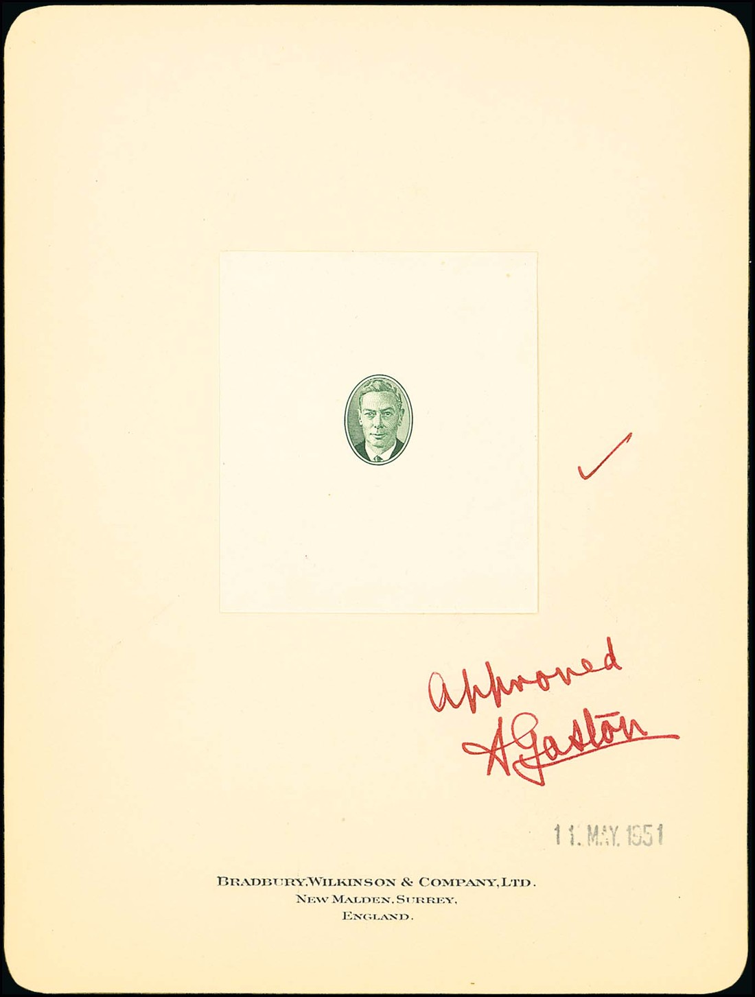 One in green with the King facing forward and with cross-hatching to suit collars, on surfaced wove paper (48x55mm.) affixed to Bradbury, Wilkinson presentation card marked "Approved A Gaston" in red ink with "11. may 18951" below, the card originally dated "24 mar 1951" on reverse. Photo