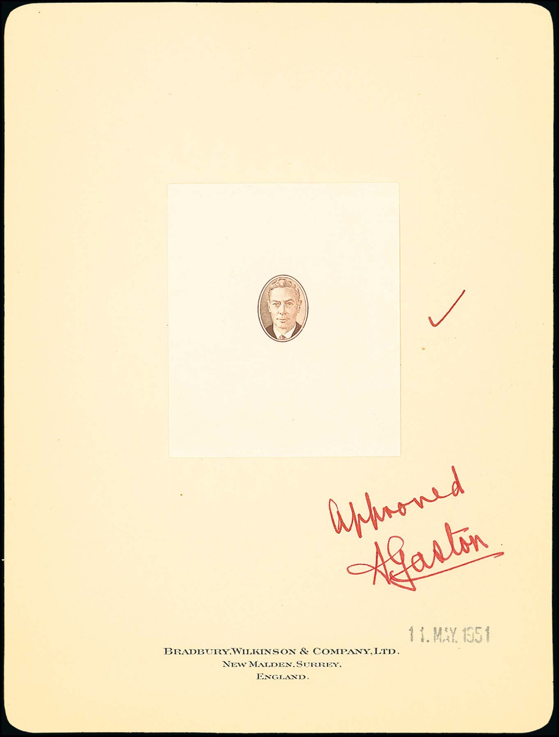 One in brown with the King facing forward and with cross-hatching to suit collars, on surfaced wove paper (48x55mm.) affixed to Bradbury, Wilkinson presentation card marked "Approved A Gaston" in red ink with "11. may 18951" below, the card originally dated "24 mar 1951" on reverse. Photo