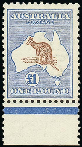 £1 brown and ultramarine from the foot of the sheet with large part original gum; a couple of slightly shortish perforations at top. Lovely colour and fresh appearance. S.G. 15, £2,750. Photo