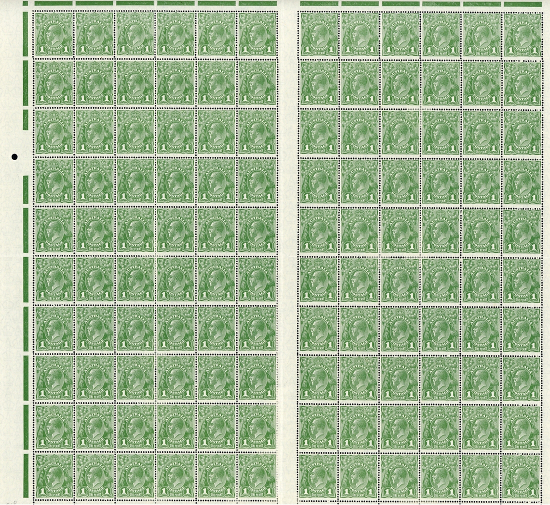 1d. green, perf 14, Plate 1, a complete mint sheet with Ash imprint comprising panes 1 and 2 showing various plate flaws including "saddle on emu" retouched and scratch through oval from kangaroo's ear to King's nose, both panes folded along central vertical perforations, some perfs at foot a little concertina'd otherwise fine unmounted mint. S.G. 86, £480+