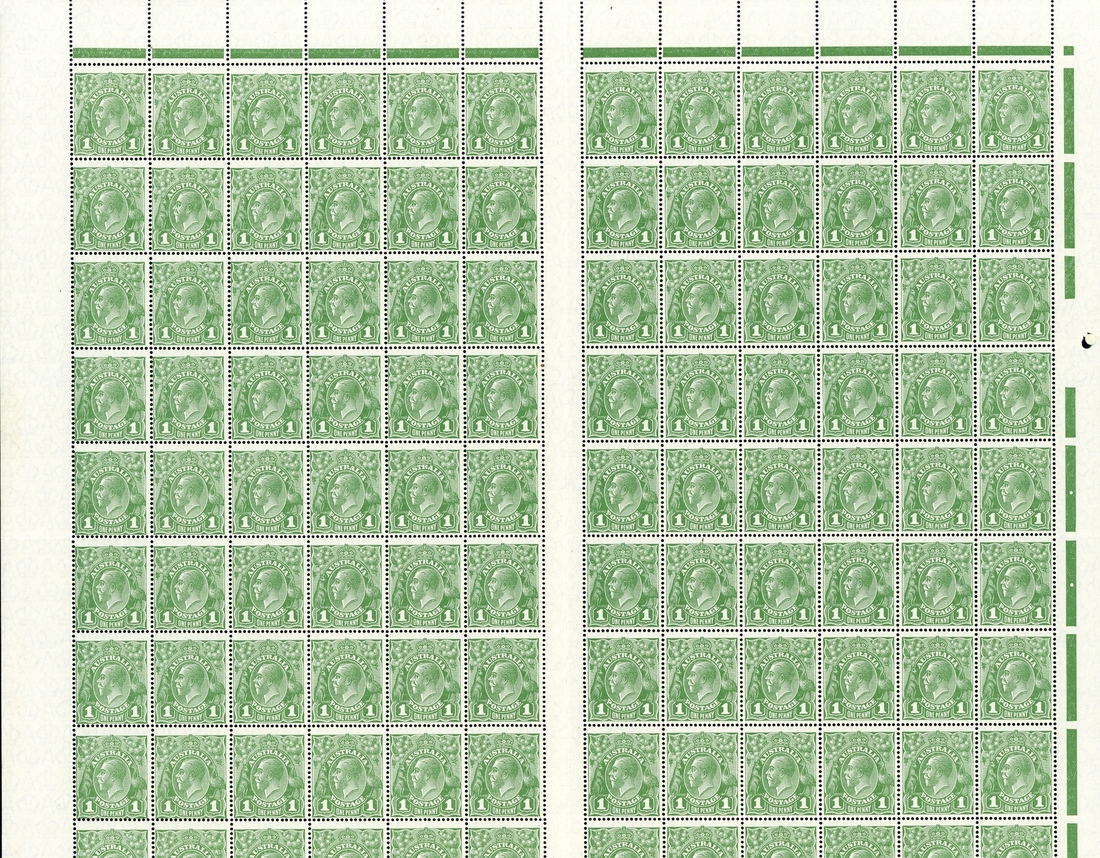 1d. green, perf 14, Plate 3, a complete mint sheet with Ash imprint ("n" over "a") comprising panes 5 and 6 showing various plate flaws including damaged lower right frame, dot before right "1" and thinned left frame, fine unmounted mint. S.G. 86/a, £530+