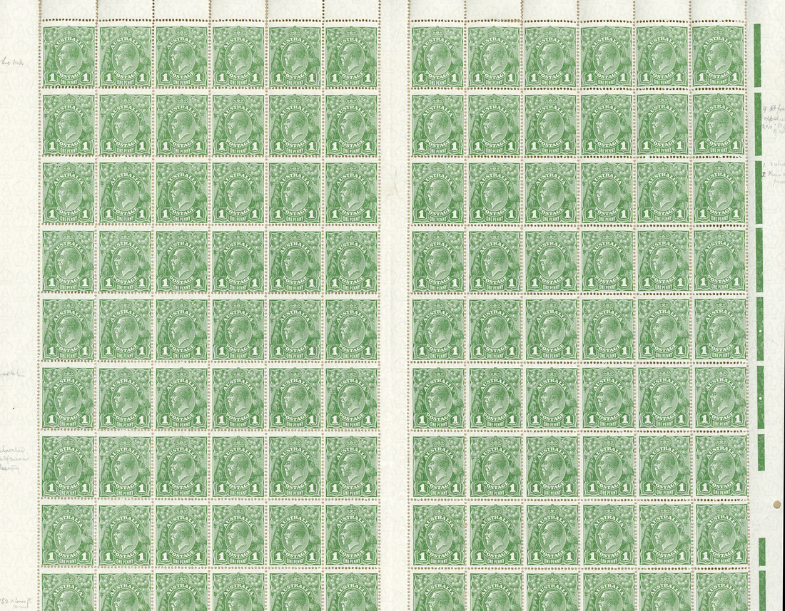 1d. green, perf 14, Plate 4, a complete mint sheet with Ash imprint ("n" over "n") comprising panes 7 and 8 showing various plate flaws including "secret mark", flaw under neck retouched and "ra" joined retouched, some pencil notations in selvedge and a few split perfs., otherwise fine unmounted mint. S.G. 86/b