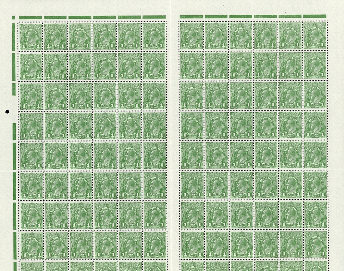 1d. green, perf 13½x12½, Plate 1, a complete mint sheet with Ash imprint comprising panes 1 and 2, the latter with columns two and three being Die II, showing various plate flaws including "saddle" on emu retouched, fine unmounted mint. S.G. 95/b, £1225+