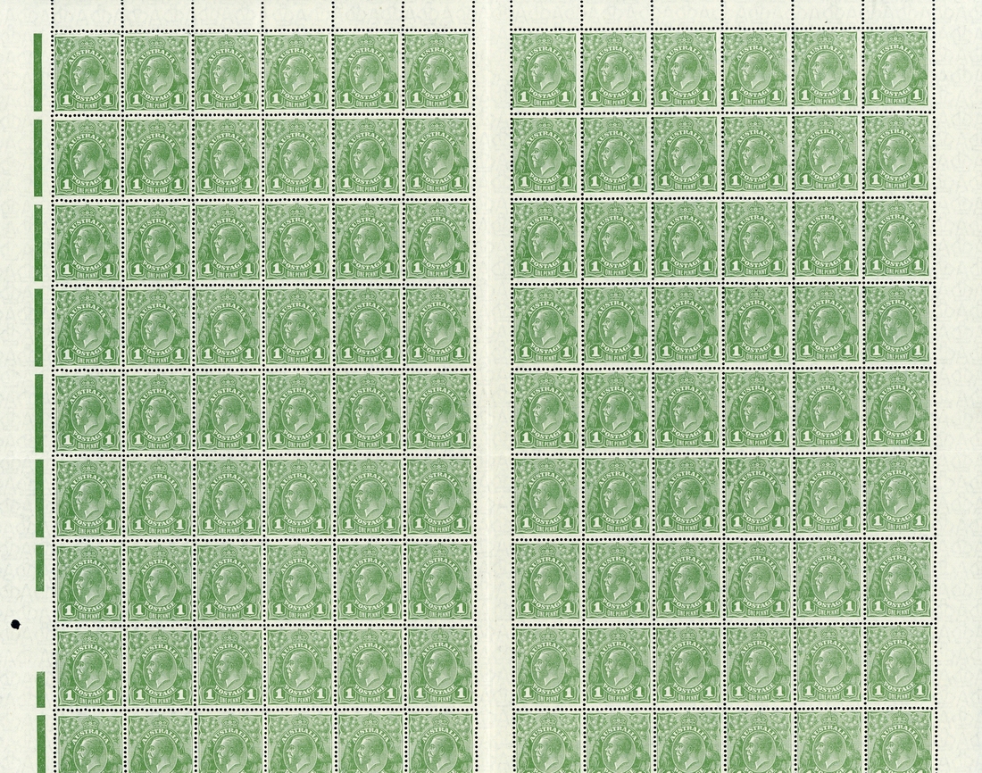 1d. green, perf 13½x12½, Plate 2, a complete mint sheet with small part Ash imprint comprising panes 3 and 4 showing various plate flaws including "penavy", white line under right value tablet and small white dot on "y" of "penny", a few split perfs otherwise fine unmounted mint. S.G. 95, £540+