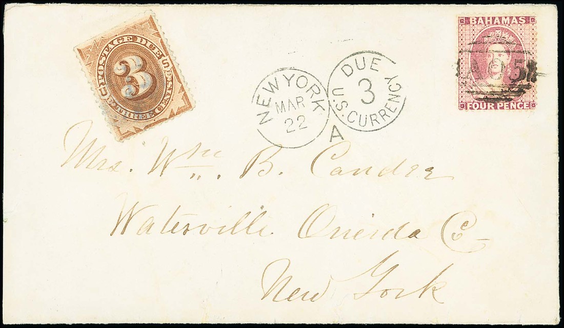 1880 (16 Mar.) envelope to Waterville NY, bearing 1876 perf 14 4d. bright rose centrally cancelled (not tied) by "A05" obliterator, showing "new york due/3/u.s. currency" h.s. (22.3) with US Postage Due 3c. applied alongside and, on reverse, despatch and arrival datestamps. A neat, clean and attractive franking. Photo