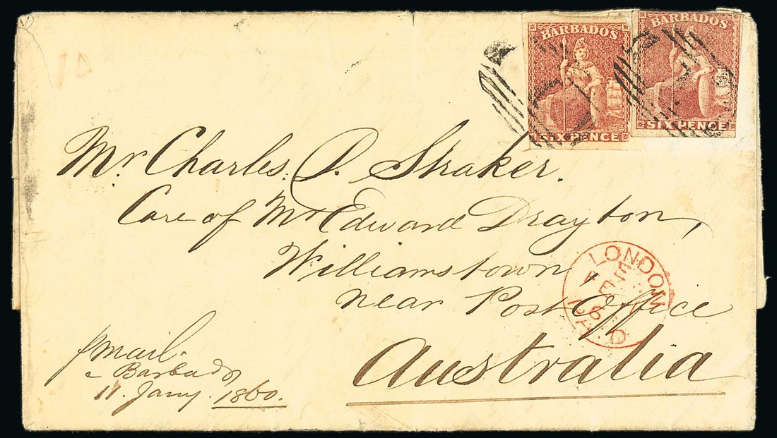 1860 (11 Jan.) entire letter to Williamstown, Victoria, bearing 1858 6d. deep rose-red (2, small faults) both clearly cancelled "1" and showing London Paid transit c.d.s. (1.2) in red below, the reverse with despatch, Melbourne (13.4) and arrival (14.4) datestamps. A scarce franking to an unusual destination. Photo