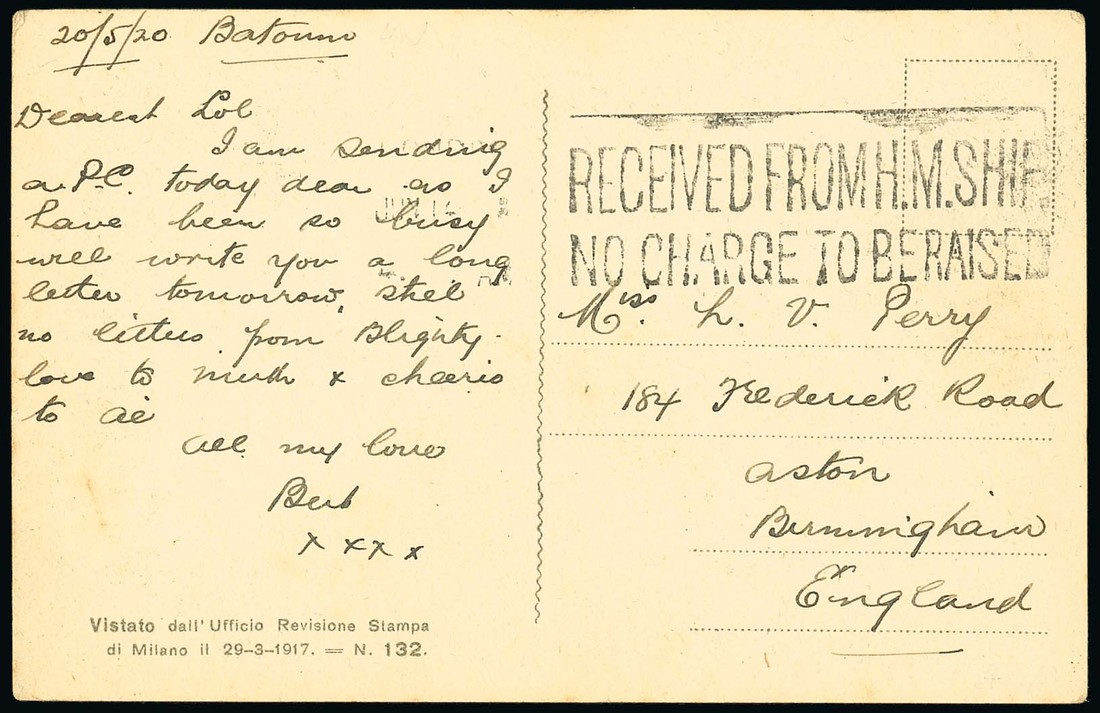 1920 (20 May) picture postcard to England, carried in diplomatic bag by British naval vessel to London, where "received from h.m.ship/no charge to be raised" h.s. was applied. An extremely rare item of mail from Batum. Photo
