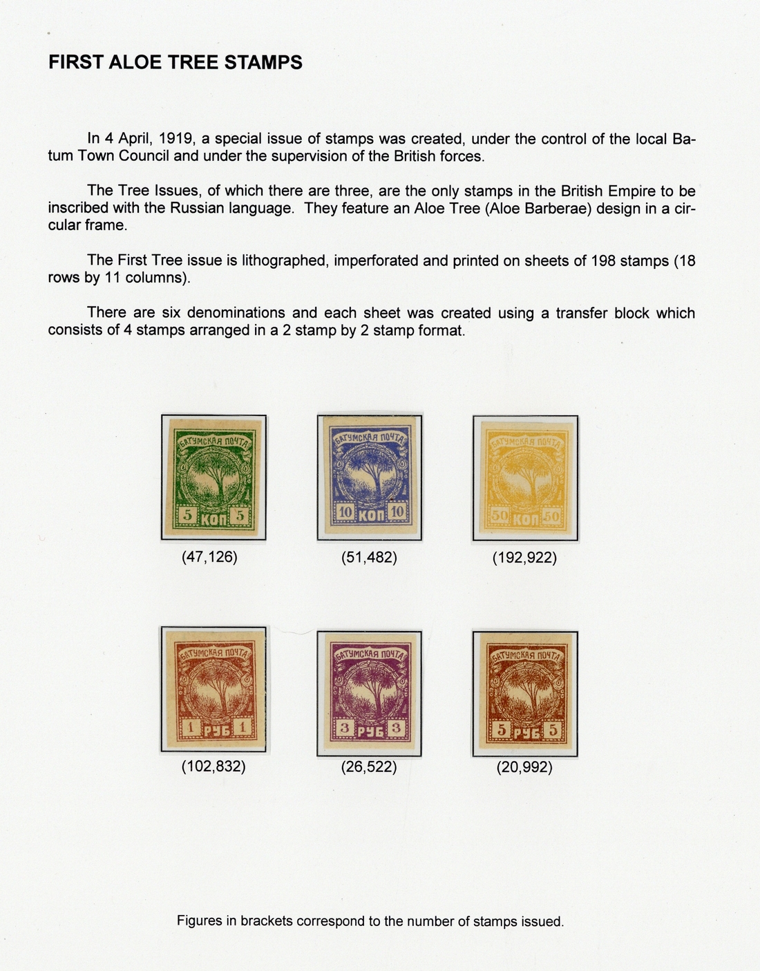 An outstanding study/collection of the Aloe Tree issue, partly mounted on over 70 exhibition pages with original research, also housed in five stockbooks or loose stock pages, all contained in carton. The first issue with the four transfer types for each value identified as well as the four different forgeries, plus the 5k. and 10k. with part Telegraph seal cancels, the 50k. with superb central strike of the Insurance seal circular intaglio h.s. (very rare). The second issue with the six transfer types for each value identified, plus examples of the three different forgeries. The first issue surcharged including 25r on 5k. (55, twenty-six in blue), 25r. on 25k. (50, seven used and one with blue surcharge) and 50r. on 50k. block of four. The third issue with the six transfer types for each value identified, the short "a" variety on each value, broken "t" on 3r., 7r., 10r. and 25r. plus examples of the three forgeries on various values. Much duplication throughout with multiples of various sizes, a large number with transfer types identified. A chiefly fine and very interesting lot with viewing strongly recommended