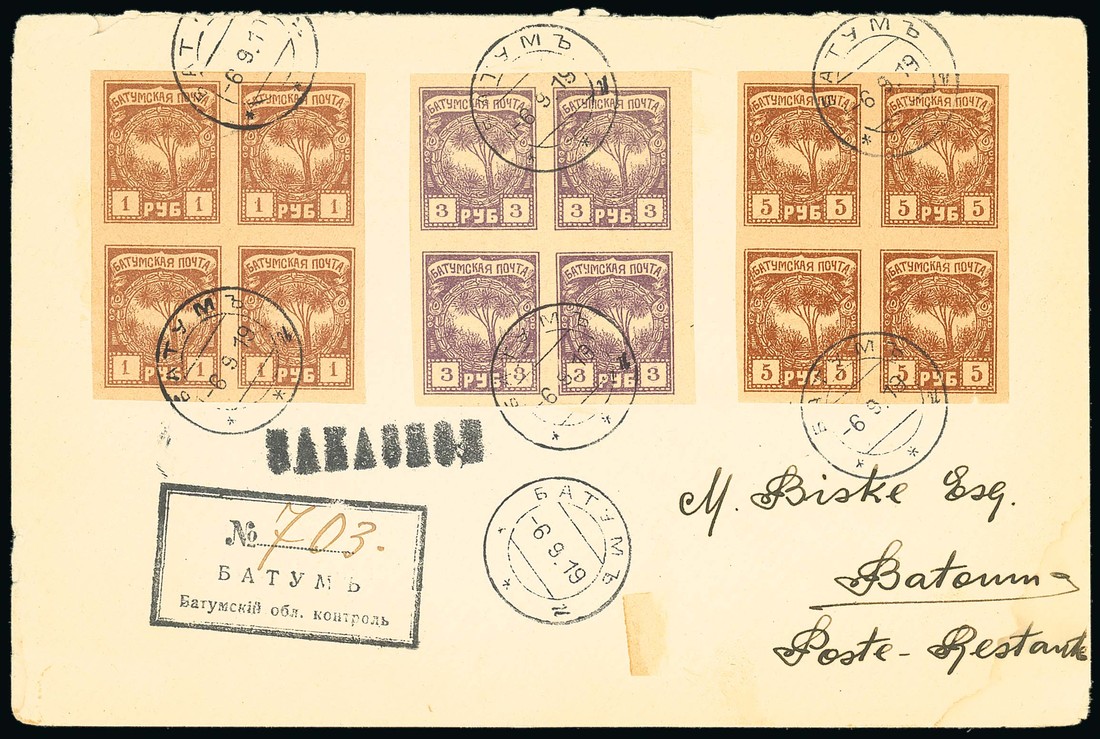 1r., 3r. and 5r. blocks of four, each tied by double-ring d.s. on 1919 (6 Sept.) envelope addressed locally and registered, showing scarce "Nº.../batum/batumshii obl. kontrol" registration handstamp. S.G. 4-6. Photo