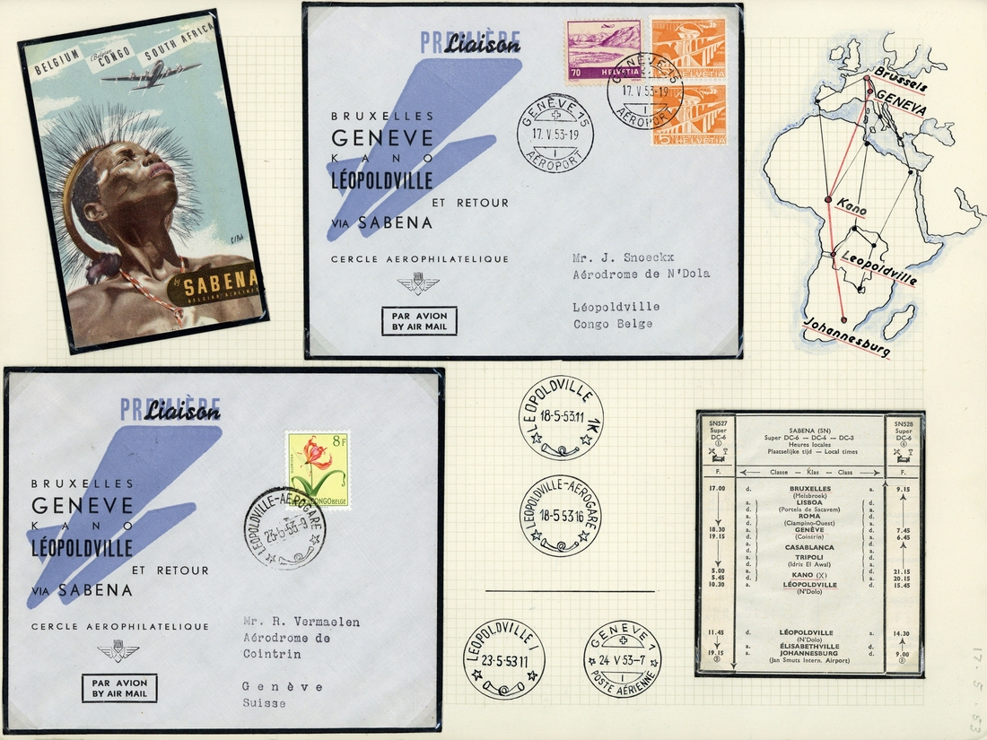1936-75 wonderfully presented collection of 112 S.A.B.E.N.A souvenir flight covers to a variety of destinations around the world, contained in a carton and accompanied by many photographs and ephemera, fine and a most attractive lot