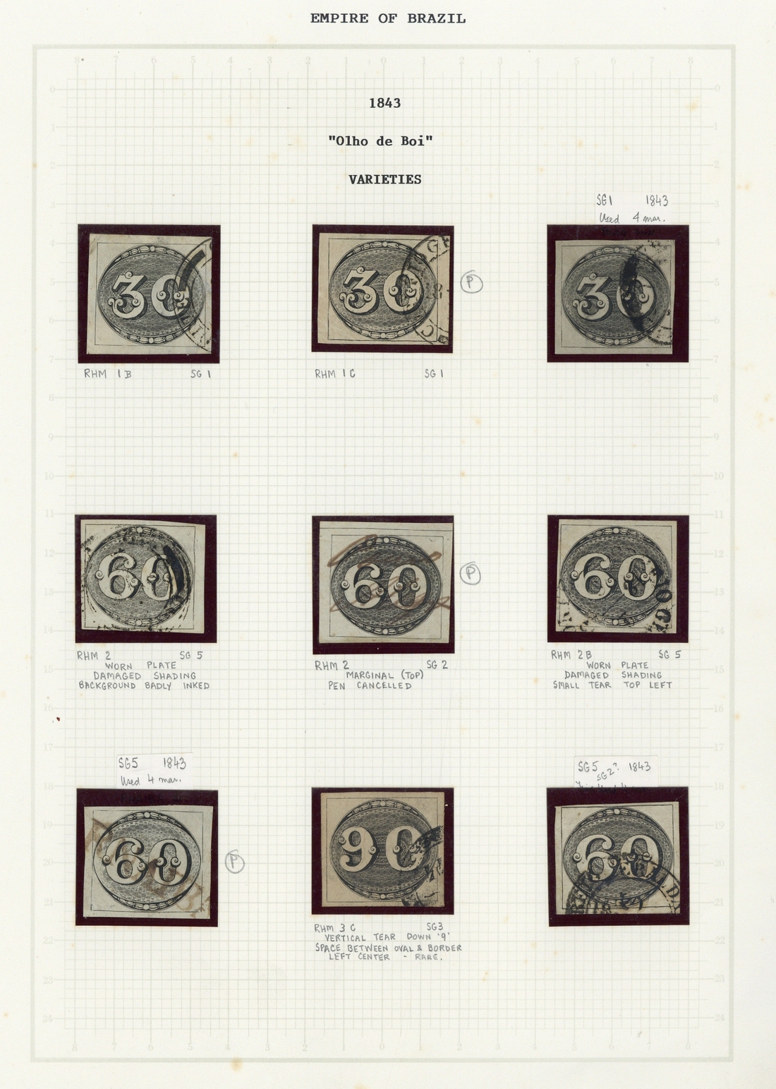 1843-89 used collection arranged on album leaves, including 1843 Bull's Eyes 30r. (4), 60r. (5), 90r.(2), all with four margins, 1844 Goat's Eyes 10r. (8), 30r. (4), 60r. (4), 90r. (2), 1850 to 600r., 1854-61 imperf. to 430r., 1866-78 Dom Pedro to 1000r. with rouletted issues; also a few covers. Condition mixed. (hundreds)