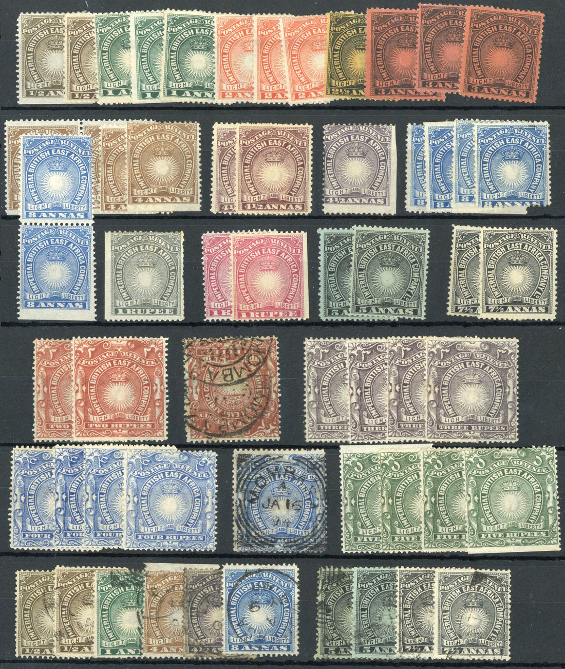 ½a. to 5r. set of fifteen less 8a. grey, with a selection of additional values to 5r. (3), and 1895 5a. (2) and 7½a. (2), unused with part to large part gum, and a used selection (12) to 4r., a few with straight-edges; fair (1r. grey) to fine