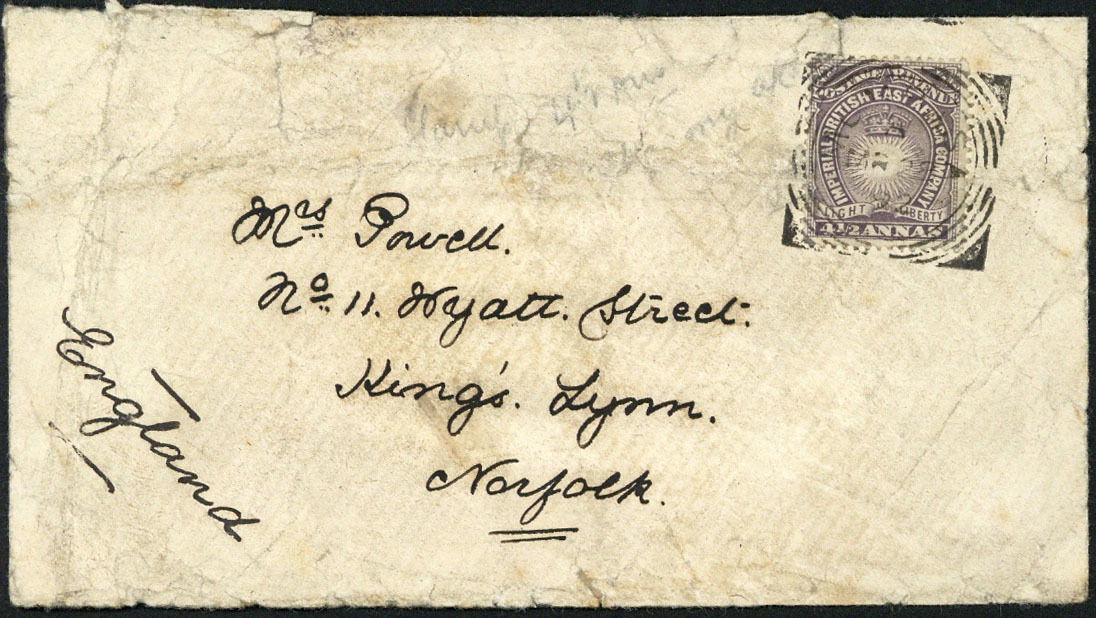 1892 (28 Mar.) envelope ex the Powell correspondence from Mombasa to England, bearing 1891 4½a. dull violet cancelled by squared-circle datestamp, King's Lynn arrival c.d.s. (19.4) on reverse; the envelope soiled and crumpled though a scarce stamp on cover