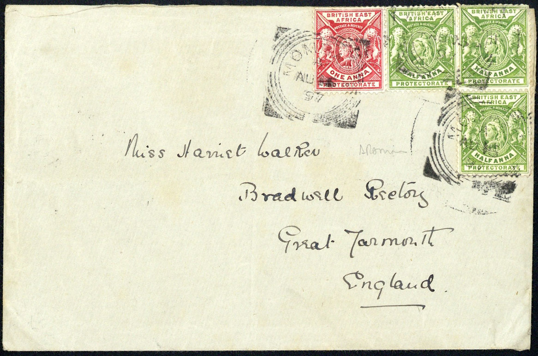 1897 (Aug.) envelope from Mombasa to England, bearing 1896 ½a. (3) and 1a. with squared-circle datestamps, Great Yarmouth arrival c.d.s. (4.9) on reverse; central vertical fold clear of the adhesives which have a few short perfs.