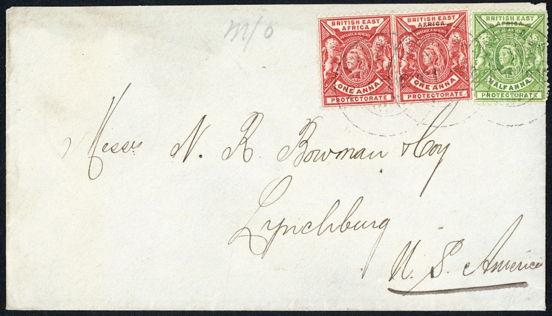 1900 (27 Oct.) envelope (part flap missing) to U.S.A., bearing 1896 ½a. and 1a. (2) lightly cancelled by double-ring datestamps, Lynchburg arrival c.d.s. (30.11) on reverse