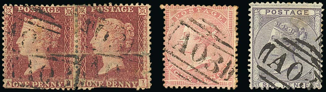 1858-60 G.B. 1d. horizontal pair (horizontal crease and defects) with four large part legible "A03" (Georgetown, Demerara) strikes, 4d. rose (surface fault and a little soiled) and 6d. lilac both with fine large part or near complete strikes. S.G. Z1-3, £1,000. Photo
