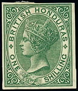 1872-79 1/- green, imperforate plate proof on watermarked paper, no gum, margins all round, close at top, fine