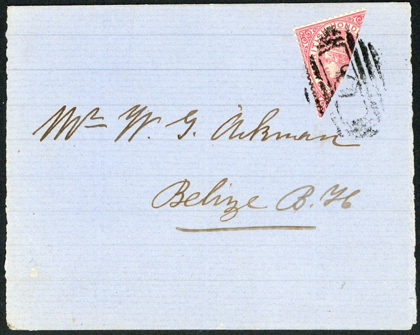 1882-87 1d. rose bisecred diagonally and tied by "O" obliterator on undated front to "Aikman" in Belize, fine. S.G. 18a