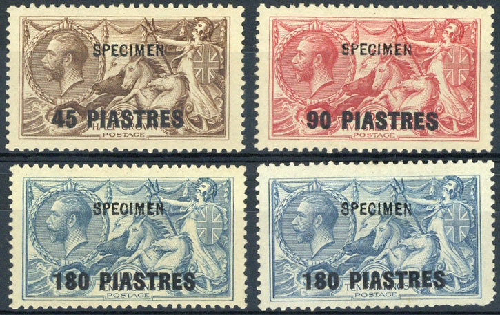 1921 45pi. on 2/6d. to 180pi. on 10/-, set of three with additional 180pi. on 10/-, each overprinted "specimen", mint; the set of three a fraction gum toned, the additional 180pi. with a few short perfs. at foot. S.G. 48s-50s