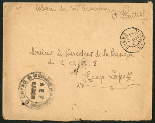 1915 unstamped envelope from Lt. Pontich to Cap Lopez, Gabon, marked "Colonne du Sud Cameroun", showing circular "le commandant de la circonscription okano/aef/gabon" cachet in black and "mitzig/gabon" double-ring transit d.s. (11.8) with N'Djole (18.9) and arrival (29.8) datestamps on reverse
