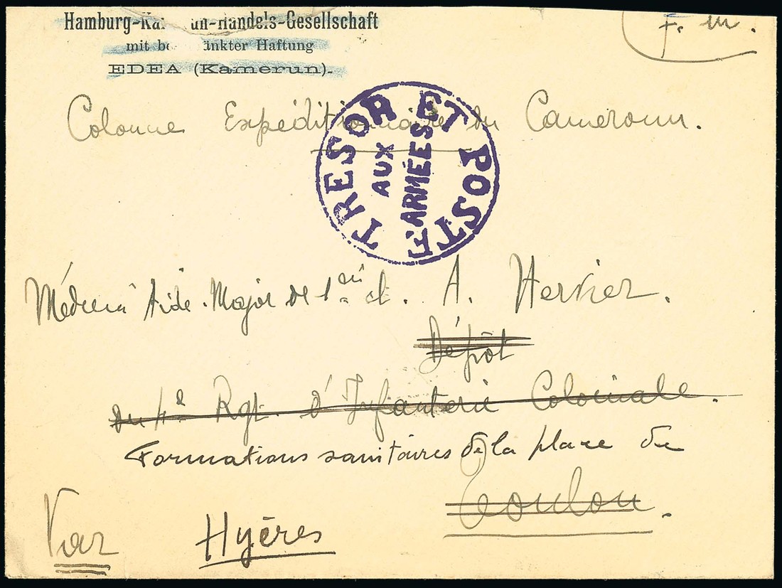 1915 unstamped envelope (part flap missing) from the French Field Hospital (probably at Edea) to Toulon and redirected to Hyéres, marked "F.M." and "Colonne Expeditionaire du Cameroun", showing fine strike of circular "tresors et poste/aux/armées" handstamp in deep violet. Photo