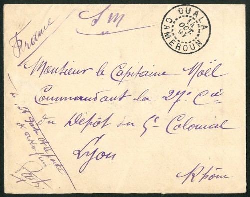 1916 (14 Oct.) unstamped envelope (small surface fault at left) to Lyon, headed "S.M.", signed by the Commandant, showing fine "duala/cameroun" double-ring d.s.