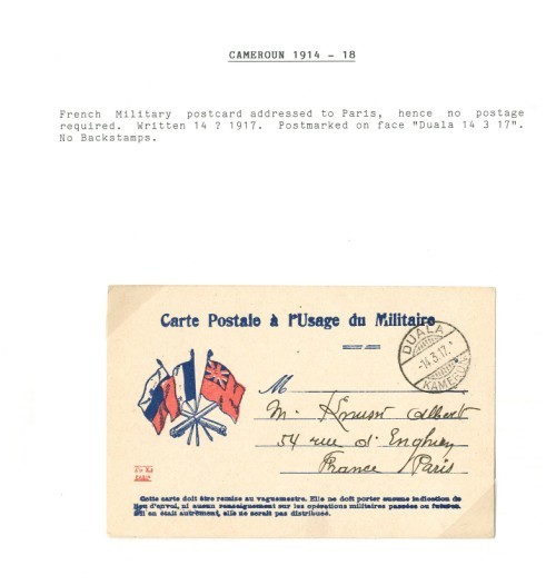 1917 (14 Mar.) unstamped "Carte Postale à l'Usage du Militaire" to Paris, showing fine Duala despatch datestamp