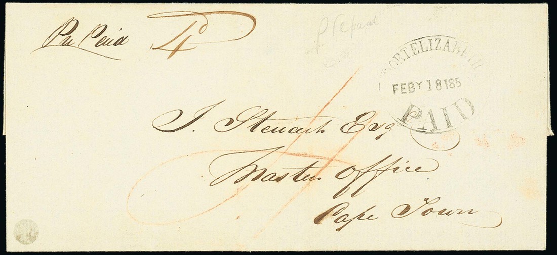 185? entire from Port Elizabeth to Cape Town, marked "Pre Paid 4d" and with a largely fine strike of the "port elizabeth/paid" oval-framed datestamp. Photo