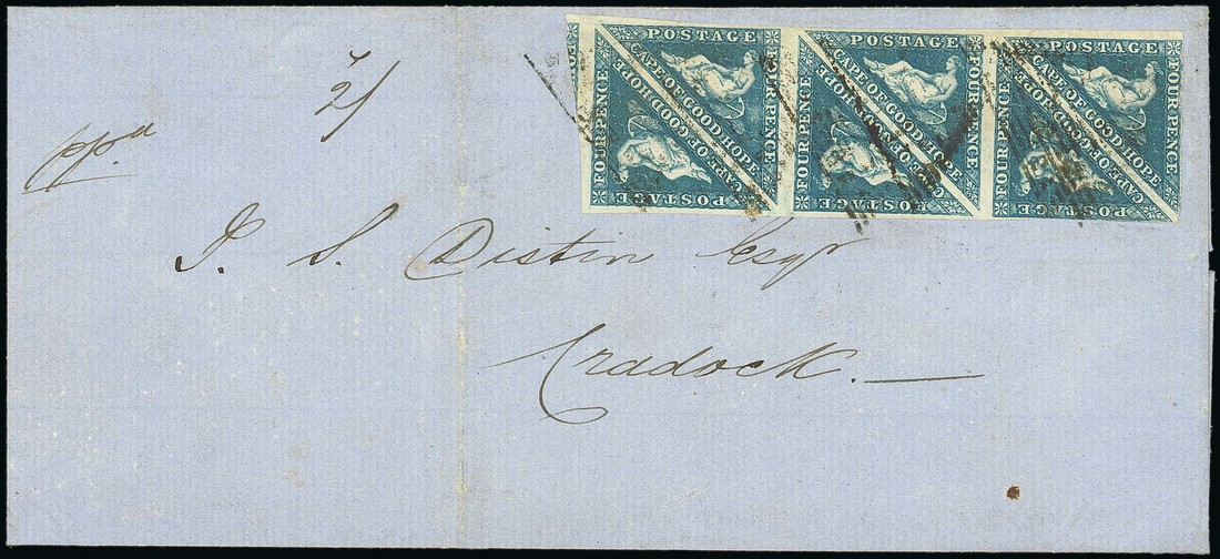 1857 (Mar.) large part entire from Cape Town to Cradock, bearing 1855-63 white paper 4d. blue block of six with just clear to huge margins on three sides, each pair with two strikes of the triangular obliterator, despatch and arrival oval datestamps on reverse. Photo
