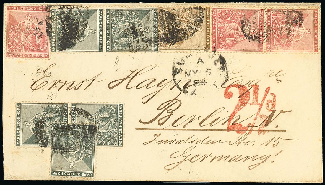 1884 (5 May) envelope from Somerset East to Germany, bearing ½d. (5), 1d. (3) and 2d. cancelled by indistinct oval of bars and with despatch c.d.s. tying two of the values, "2½d" accountancy handstamp in red alongside, Cape Town c.d.s. (7.5) on reverse; trivial imperfections though an unusual franking. Photo