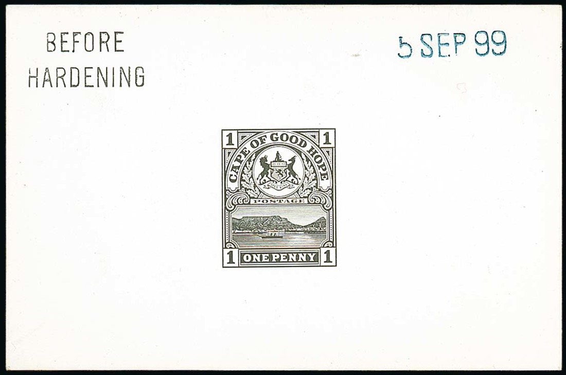 Die proof in black on glazed card (92x60mm.), marked "before hardening" and dated "5 sep 99"; fine. Photo