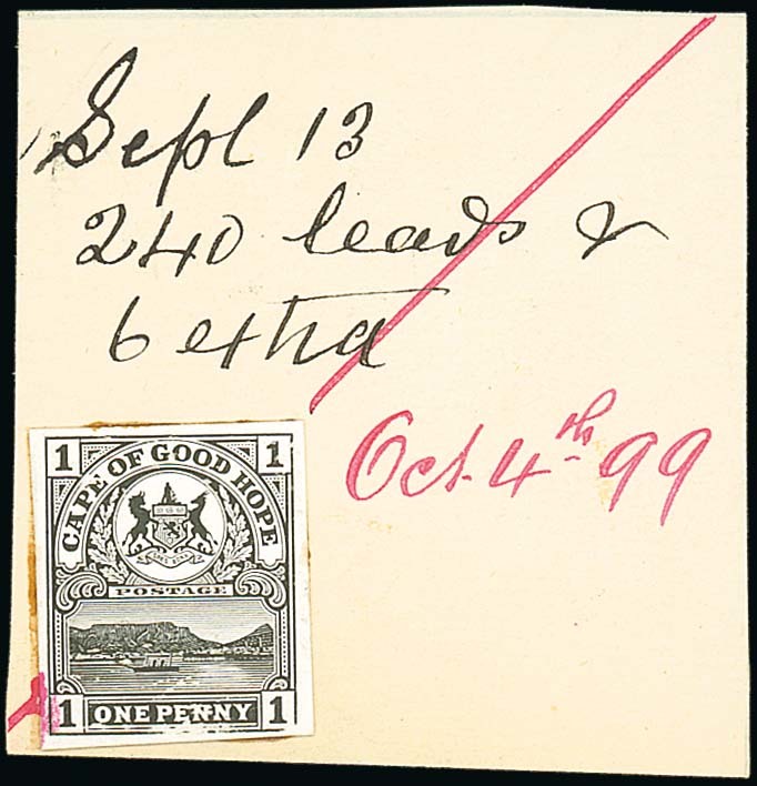 Die proof in black, stamp-size and affixed to De La Rue day book piece marked "Sept 13 240 leads & 6 extra" and further dated "Oct. 14th 99" in red ink. Unique. Photo