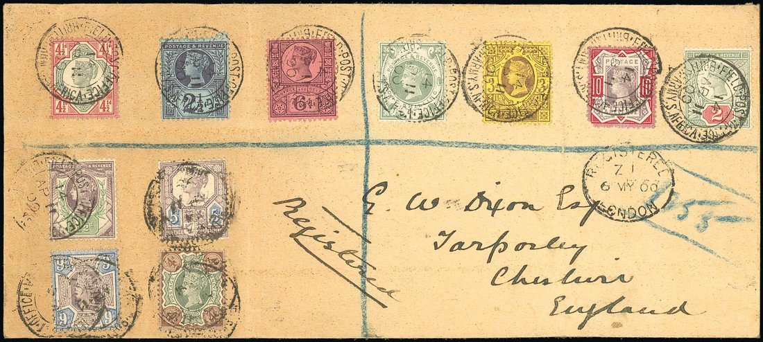 1900 (6 May) envelope (creases) registered to England, bearing 1887-92 1½d. to 1/- (eleven values, 10d. with rounded corner) with "field post office b.o./british army south africa" cancellations. S.G. Z4-14. Photo
