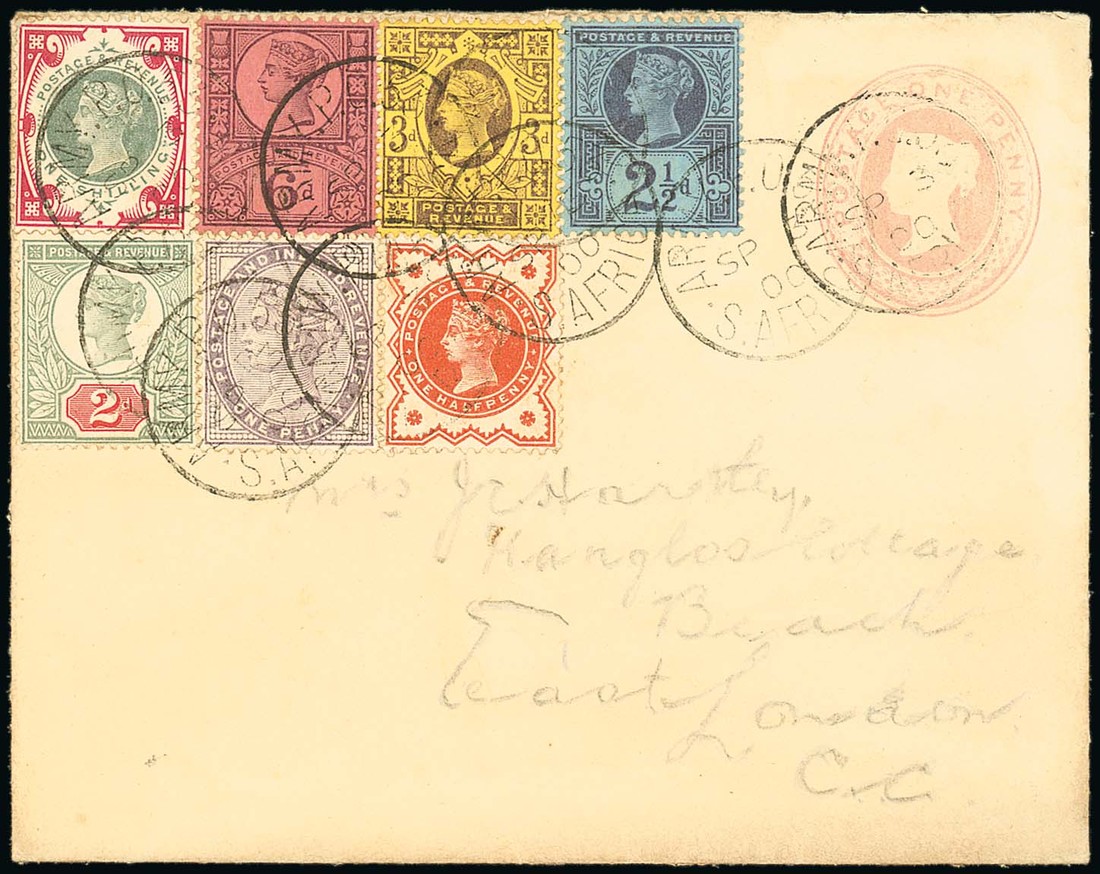 1900 (3 Sept.) 1d. envelope to East London, uprated with 1881 1d., 1887-92 ½d., 2d., 2½d., 3d., 6d., and 1900 1/- green and carmine; arrival datestamp on reverse, fine. Photo