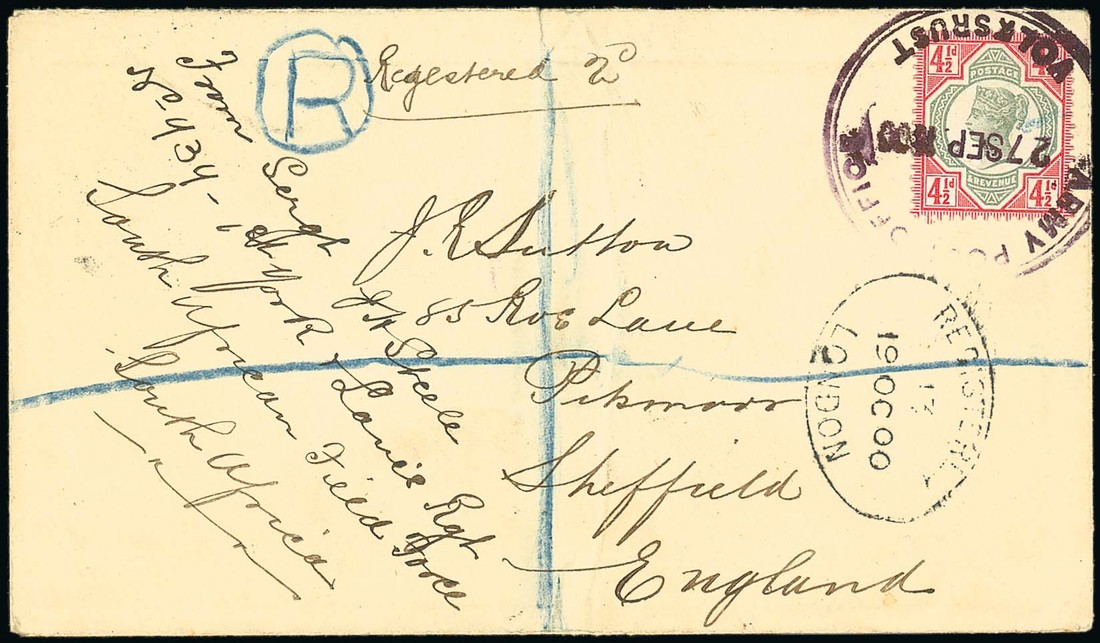1900 (27 Sept.) envelope (central fold) registered to England, bearing 1887-92 4½d. green and carmine tied by large violet "army post office/volksrust" c.d.s., arrival d.s. (20.10) on reverse. S.G. Z9. Photo