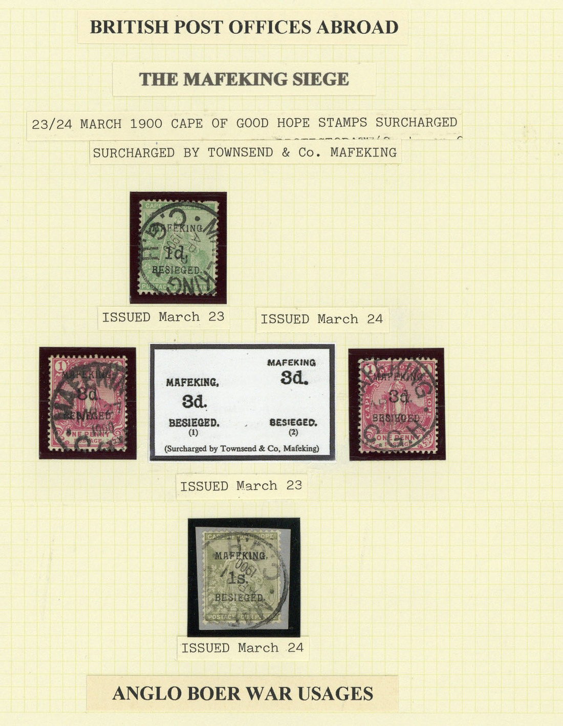 1900 selection (7) including on Cape of Good Hope 3d. on 1d. with part original gum (creased) and 1/- on 4d. fine used on piece, also 10/- Siege Note (creased and stained) and "Mafeking's Relieved" card used to Umtali