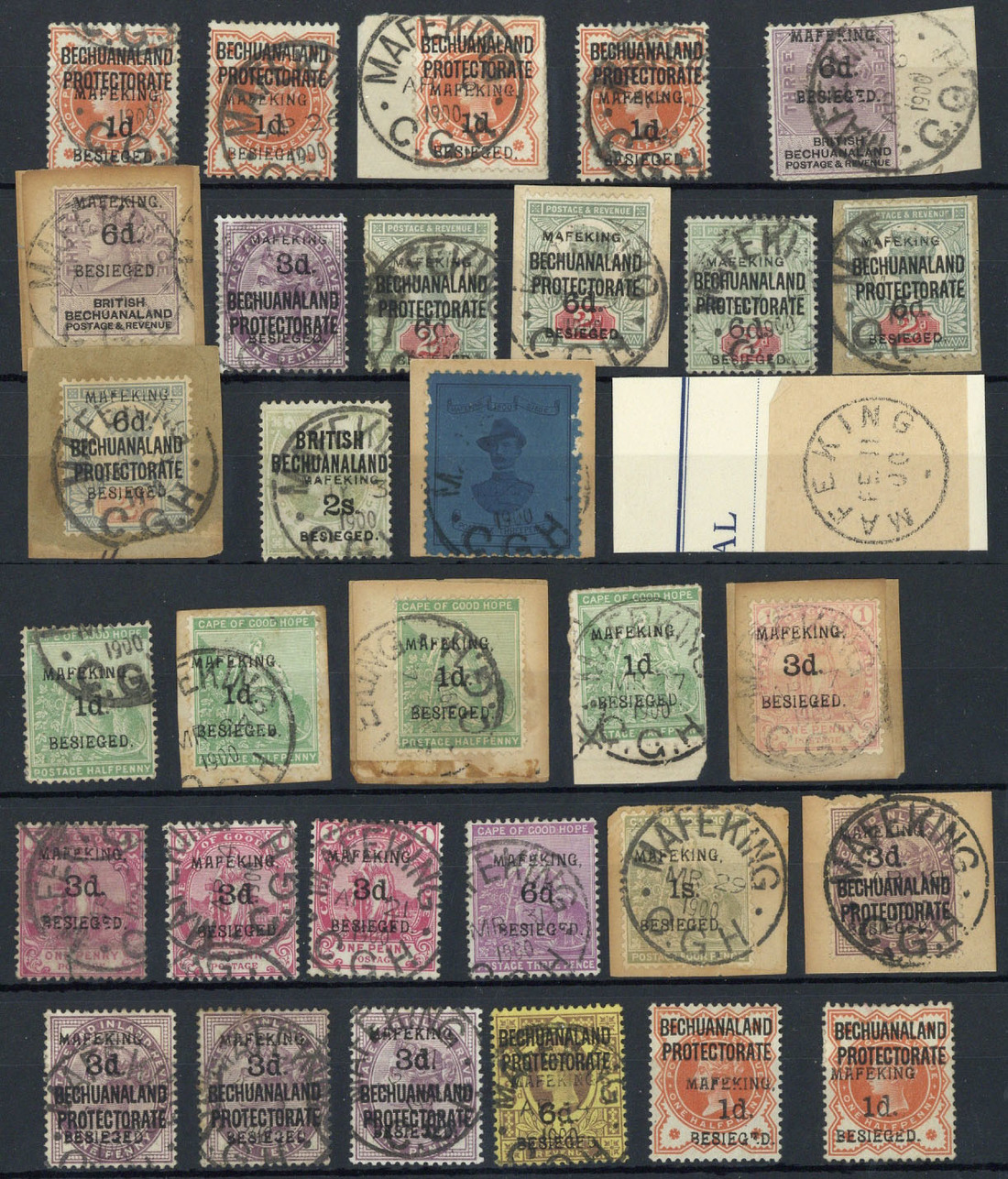 1900 (Mar.-Apr.) seriffed overprint, on Cape 1d. on ½d. Hope seated (4), 3d. on 1d. (4), 6d. on 3d. and 1/- on 4d., on Bechuanaland Protectorate 1d. on ½d. (6, two unused) and 3d. on 1d. (4), on British Bechuanaland 6d. on 3d. (2); sans-serif overprint, on Bechuanaland Protectorate, 3d. on 1d. and 6d. on 2d. (5), on British Bechuanaland 2/- on 1/-, and (6-10 Apr.) 3d. 21mm. wide, used with eleven on pieces; the 2/- and another heavily faded, the 3d. blue defective. Also Commando Brief labels unused, used (2) and forgery sheet of eight. Mainly of good to fine appearance. Cat. £6,000+