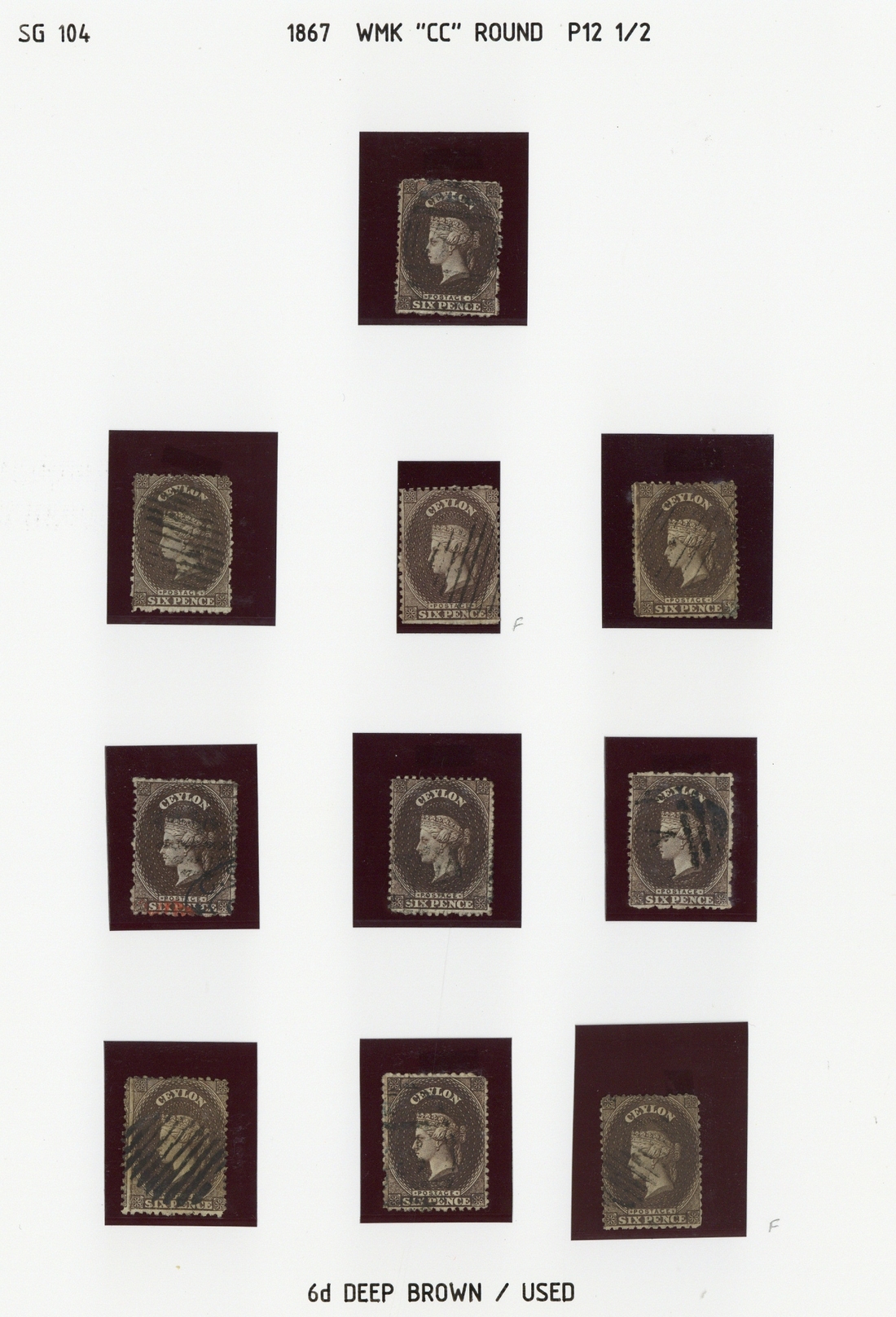 6d. deep brown (10), 8d., 9d. (4), 10d. (8) and 2/- (2), used, generally good to fine. Cat. £400 approx.
