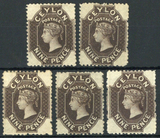 9d. blackish brown (5), all unused, most without gum, generally good to fine. S.G. 69b, £350