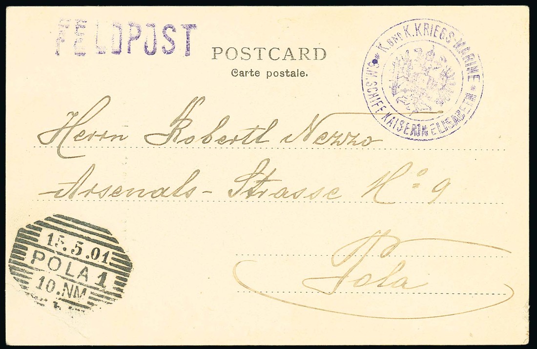 1901 (Apr.) picture postcard to Pola showing a very fine strike of the "k und k. kriegs-marine/s.m. schiff kaiserin elisabeth" double-ring cachet with double eagle emblem in centre (type 1) in purple, straight-line "feldpost" at left and Pola arrival datestamp (15.5) at left; minor corner crease, exceptionally fresh and fine. Photo