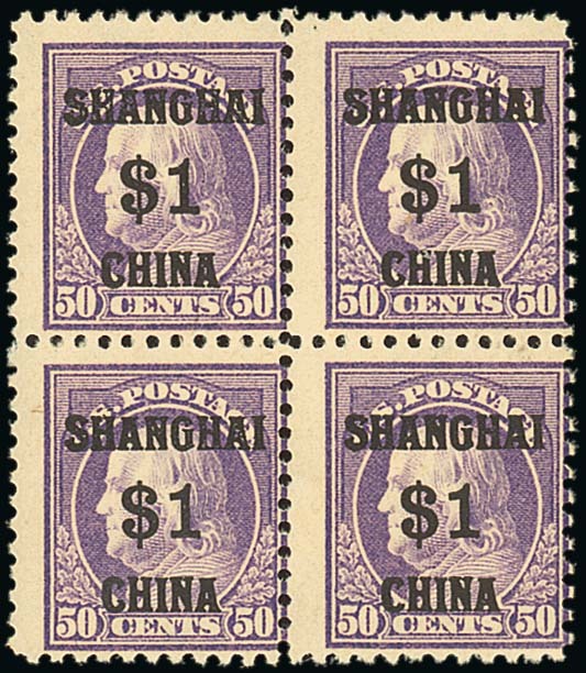 1919 $1 on 50c. light violet in a block of four, fresh and lightly mounted mint. Scott K15. Photo