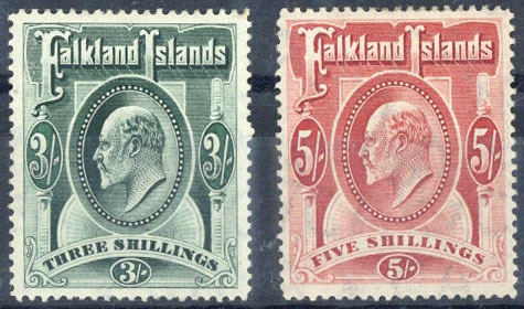 1904-12 3/- green and 5/- red, large part original gum; fine. S.G. 49-50, £405