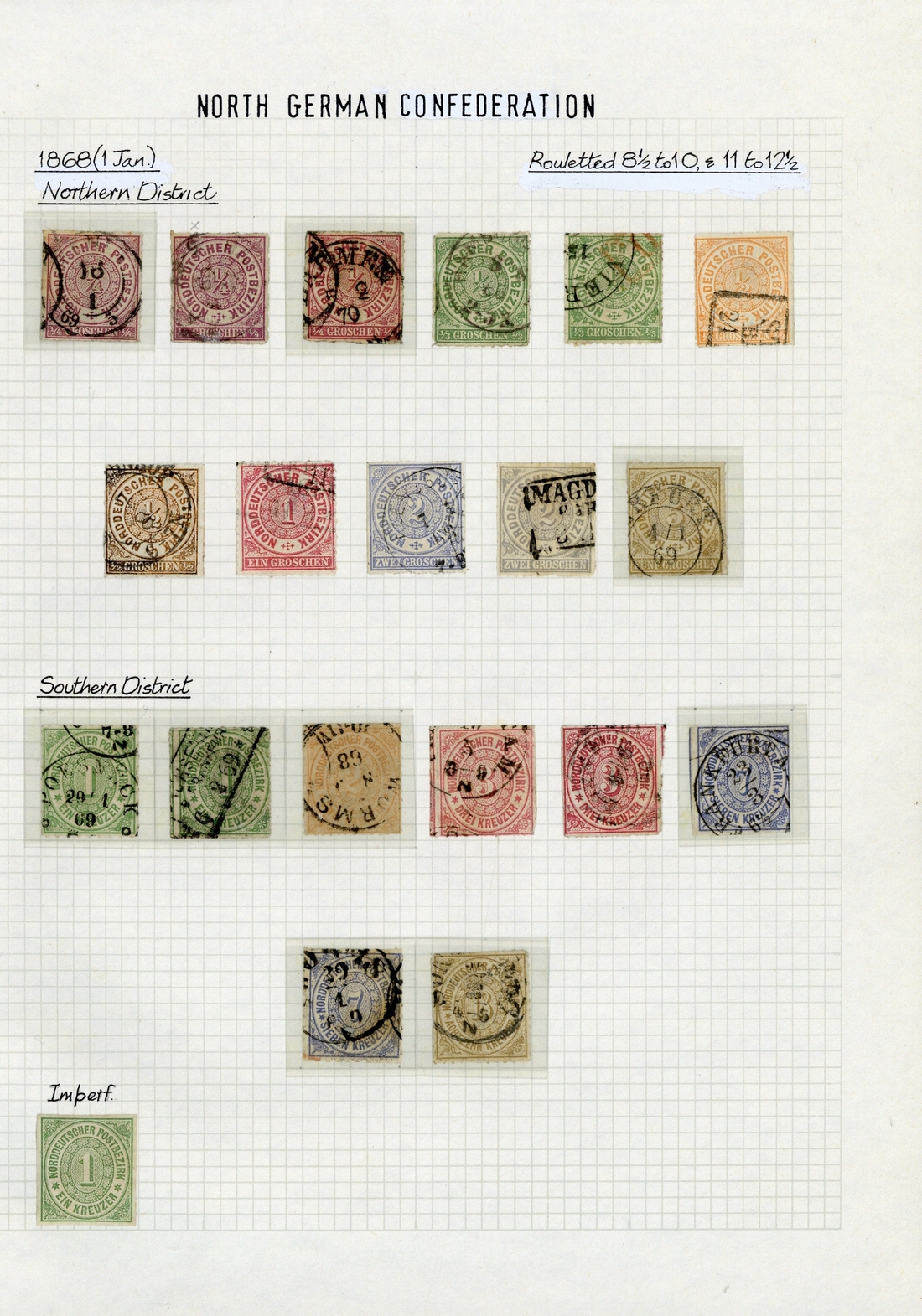 1868-70 mostly used collection (56) on pages, including 1868 rouletted Northern District to 5g., Southern District to 18k., 1869 perf. Northern District to 5g., Southern District to 18k. (used, signed Pfenninger), 1869 10g. and 30g. pen-cancelled, 1870 Official ¼g. used pair, etc., chiefly fine