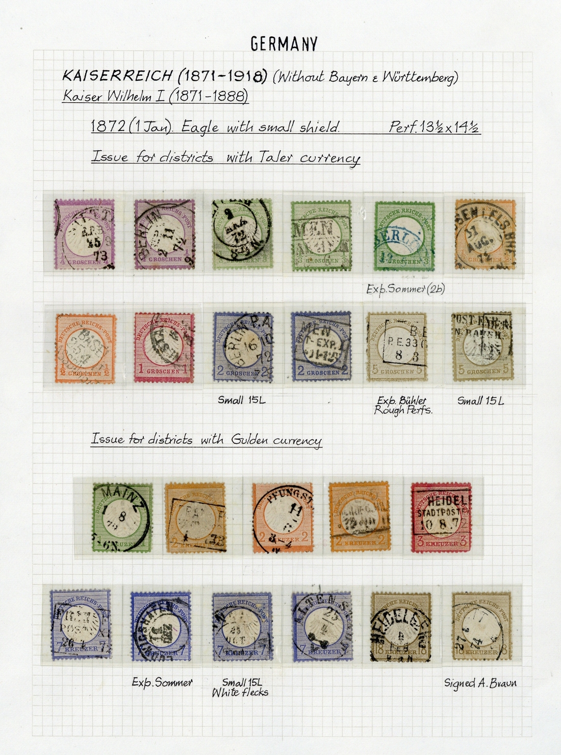 1872-74 mint and used collection (61), including 1872 small shield 5g. (2), 18k. (2), 1872 10g. and 30g. with gum, 10g. single, 30g. pair with manuscript cancellations, 1872 large shield 2½g. deep brown (Bühler (1999) certificate "ein Qualitätssück!"), 5g. (2), 7k. 9k. (2), 18k. used (signed Bühler), 1874 2½ on 2½g. (2, one "1" in fraction to left of "2"), 9k. (2), etc., chiefly used, mostly good to fine