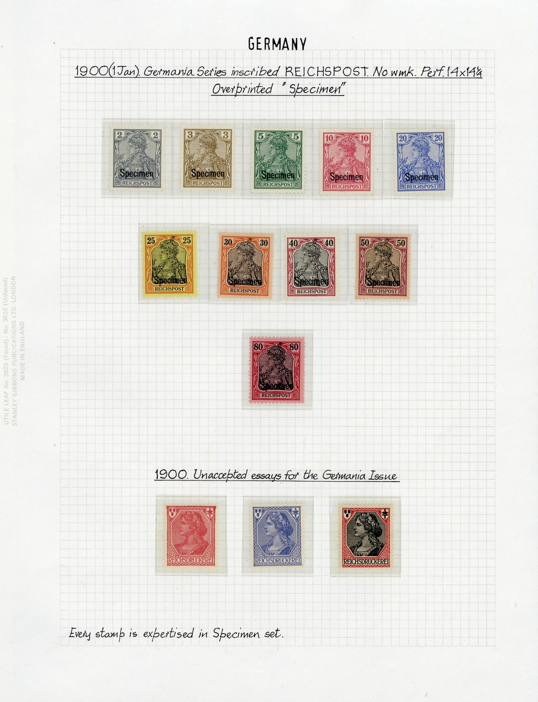 Mint and used selection (74) on pages, including three undenominated essays in different colours, 2pf. to 5m. overprinted "Specimen" (5m. stuck down on page), 10pf. Chemnitz postal forgery (Oechsner (1996) Certificate), 2pf. to 80pf. with part original gum, 30pf. thick inscription (Jäschke (1994) Certificate), 3pf. and 10pf. imperf. 10pf. printed double, one inverted, 1m. (2), 2m. (type I and II), 3m. (2), 5m. (3) with part original gum, values to 5m. (3) used, etc., chiefly fine and many signed or with certificates from various experts