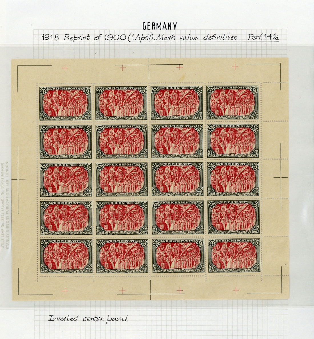 1m., 2m., 3m., 5m. and 5m. centre inverted 1918 reprints, each in a mint perf. 14½ sheet of twenty with "nachdruck" on reverse; fine