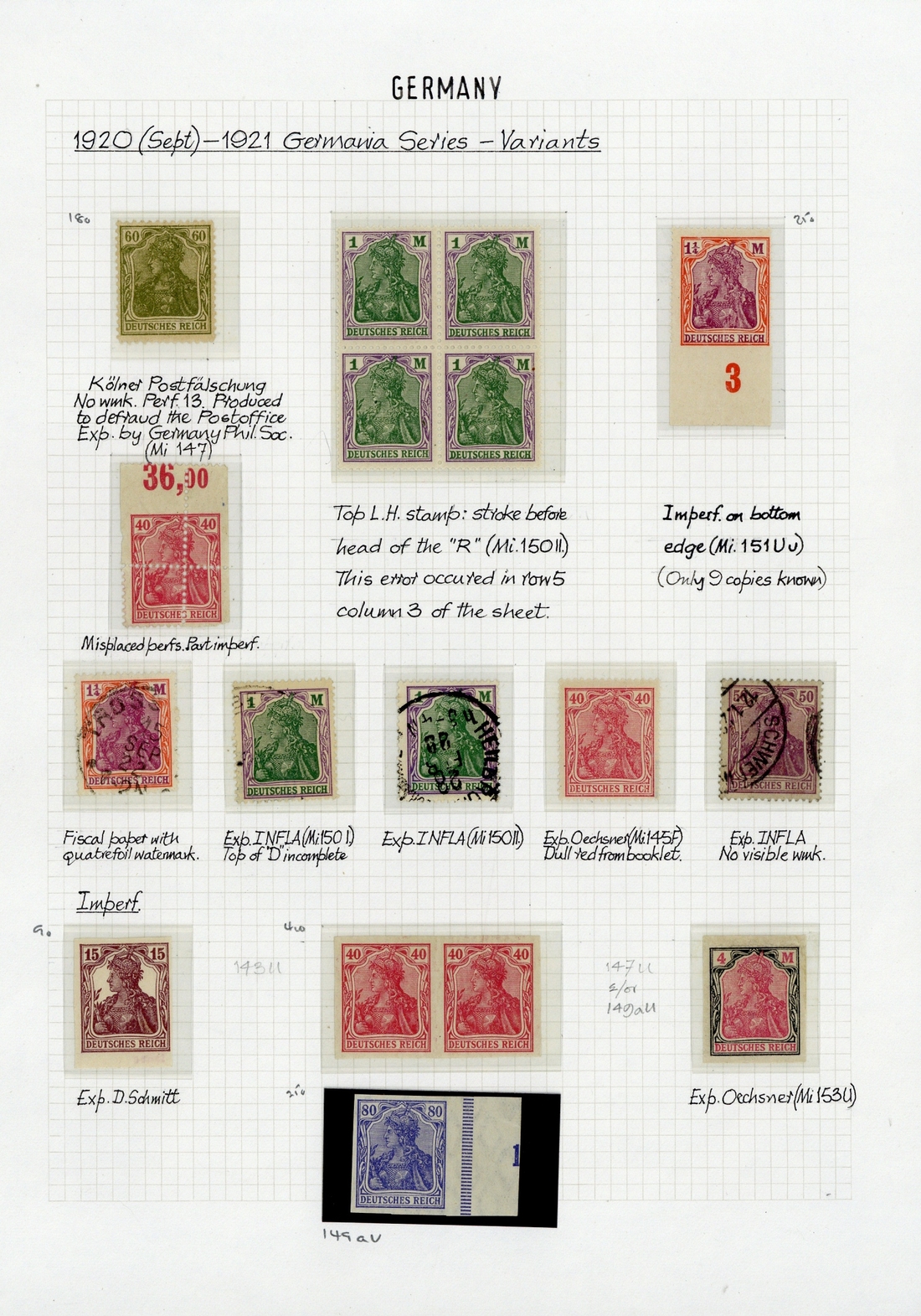 1920-21 new colours and values, mint and used selection (26) including 15pf., 20pf. (pair), 80pf. and 4m. imperf., 60pf. Kölner postal forgery, 1¼m. imperf.. between stamps and margin at foot, etc., many signed by a variety of experts