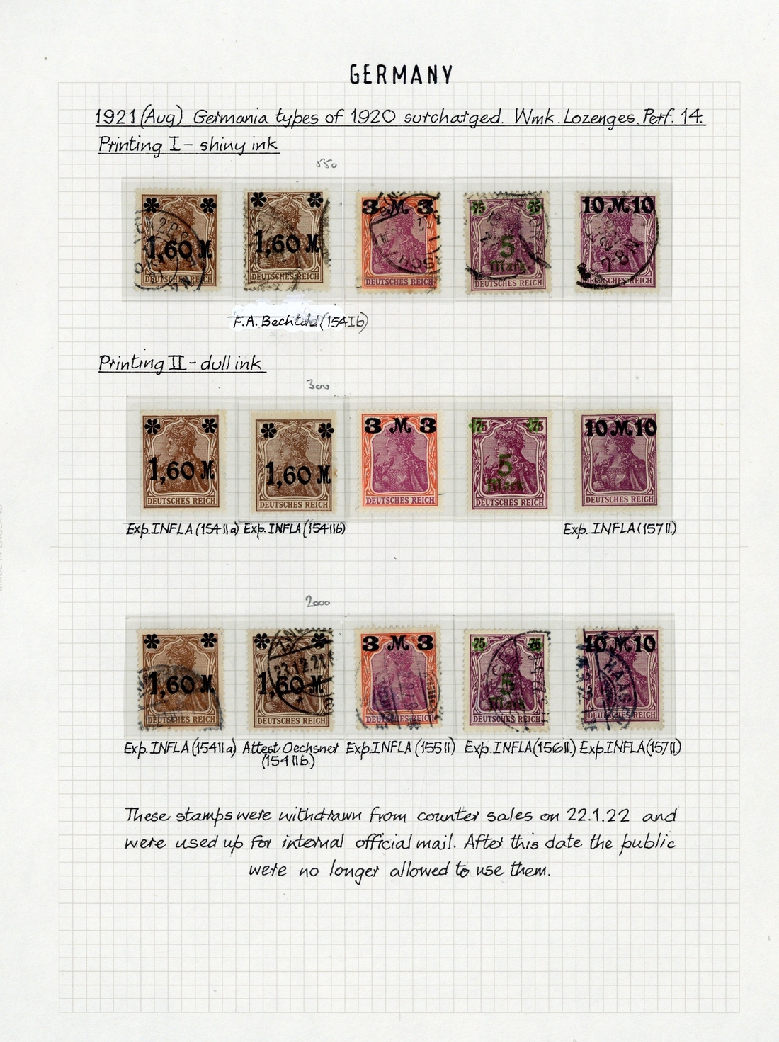1921-23 mint and used collection housed in a black album, hundreds including 1921 surcharges with shiny ink. 1m. 60 on 5pf. deep brown used (Bechtold (1995) Certificate), dull ink 1m. 60 on 5pg. deep brown used (Oechsner (1989) Certificate), 1921-22 5pf., 10pf., 15pf., 30pf., 120pf., 160pf. all used and signed by various experts, 20m. background inverted used (signed Infla, Bechtold), 20m. background printed double unmounted mint (Bechtold (1998) Certificate), 1922 Posthorn 5m. imperf., 50m. watermark quatrefoil (2 used, signed Infla and Peschl), 1922-23 Air 50pf. imperforate between stamp and margin at foot (Oechsner (2006) Certificate), etc., chiefly fine and with many signed by various experts. A valuable lot with careful viewing essential
